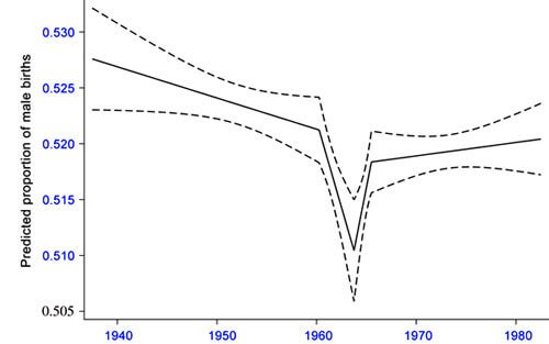 While analyzing the data, Song found that just one year after the famine the percentage of male birth had fallen drastically-from 109 boys to 100 girls in April 1960 to 104 boys to 100 girls by October 1963. After further examining the data, he found that it was until July 1965 that it took the ratio to return to its normal pre-famine levels.